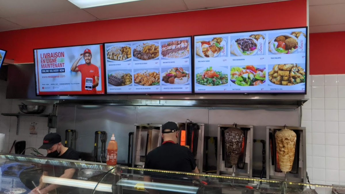 Restaurant Amir offers a diverse and flavorful menu that highlights the best of Mediterranean and Middle Eastern cuisine. One of the standout options is the Spinach Salad, a light and refreshing choice, perfect for those seeking a healthy start to their meal. For a heartier dish, the Beef Shawarma is a crowd favorite, featuring tender, seasoned beef served with all the traditional accompaniments. Another must-try is the Trio Shawarma Poulet, which combines three variations of chicken shawarma, offering a delightful mix of flavors. With its generous portions and fresh ingredients, Restaurant Amir’s menu delivers a satisfying dining experience that caters to a wide range of tastes. Whether you're craving a light bite or a fulfilling meal, this restaurant ensures a delicious and authentic taste of the region.